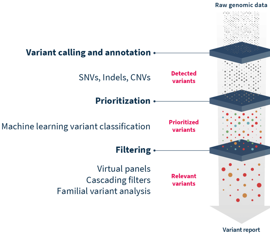 Determining which variants are pathogenic and which are not can be a difficult task. The drawback, of course, of WES versus a targeted gene panel, is that there are much more data to deal with. WES runs commonly find tens of thousands of variants - in extreme cases, hundreds of thousands.15,16 This can introduce an order of magnitude of noise into a dataset. Applying a few key rules and variant filtering strategies can reduce the number of variants by 90-95% so that researchers might then be faced with 150-500 candidate mutations, a much more manageable number.16 Further investigation requires consulting scientific databases and repositories to determine whether the detected exonic variants are pathogenic, benign, or variants of unknown significance (VUS). Unfortunately, there is no single, all-encompassing database that contains all the information needed to interpret variants. That means, unless researchers have access to software that taps into tens of different databases, it will take substantial time to manually check through one by one. In addition, despite the vast amount of information available, a significant proportion of detected variants are still VUS, highlighting the ever-growing need for more research in the field.