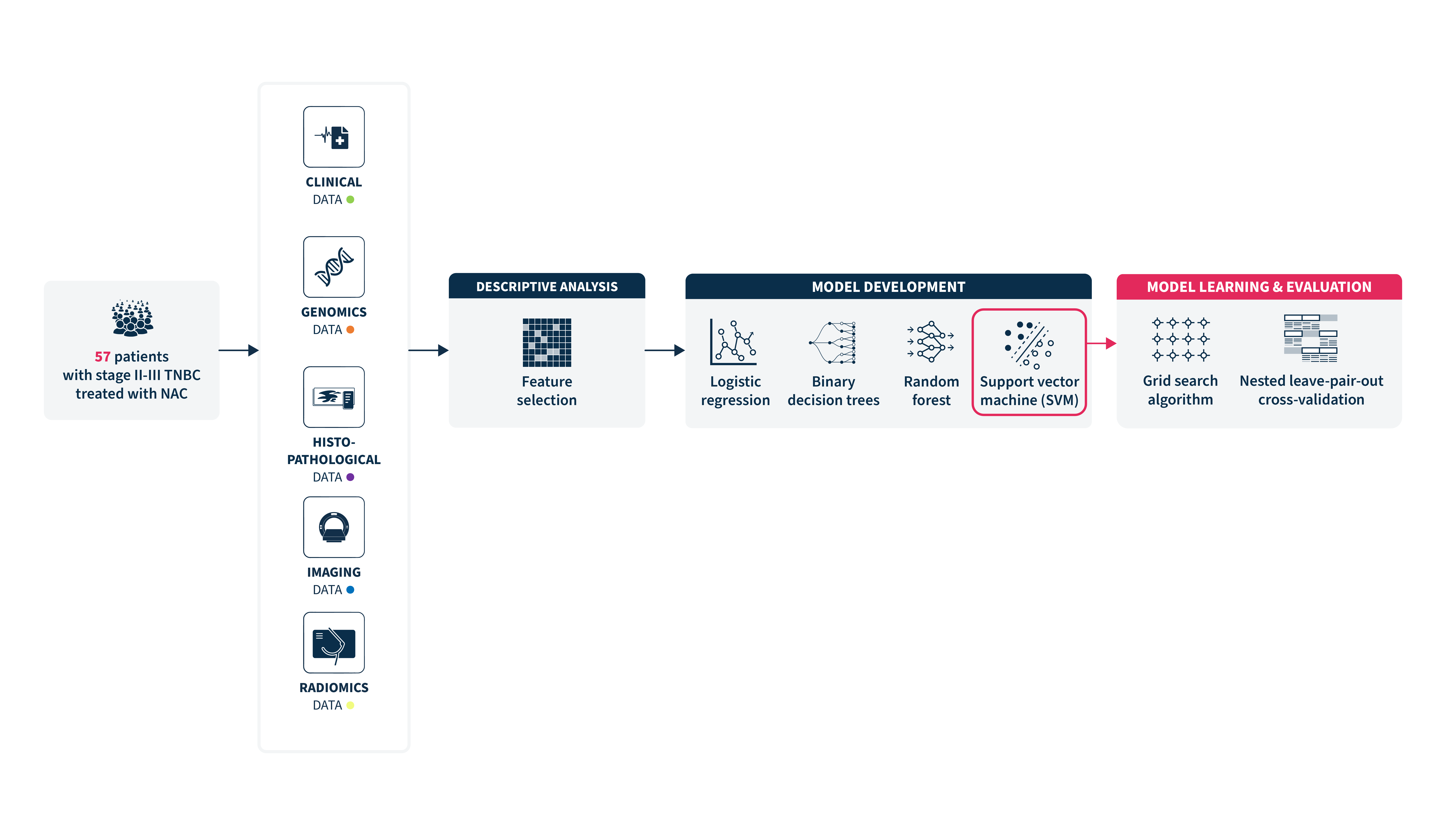 This proof-of-concept study, designed and developed by SOPHiA GENETICS in collaboration with AP-HP Hôpital Saint Louis and INSERM, aims to develop a multimodal machine learning (ML) model predictive of pCR, integrating multiple patient baseline parameters, such as clinical, histopathological, genomic, and PET imaging.