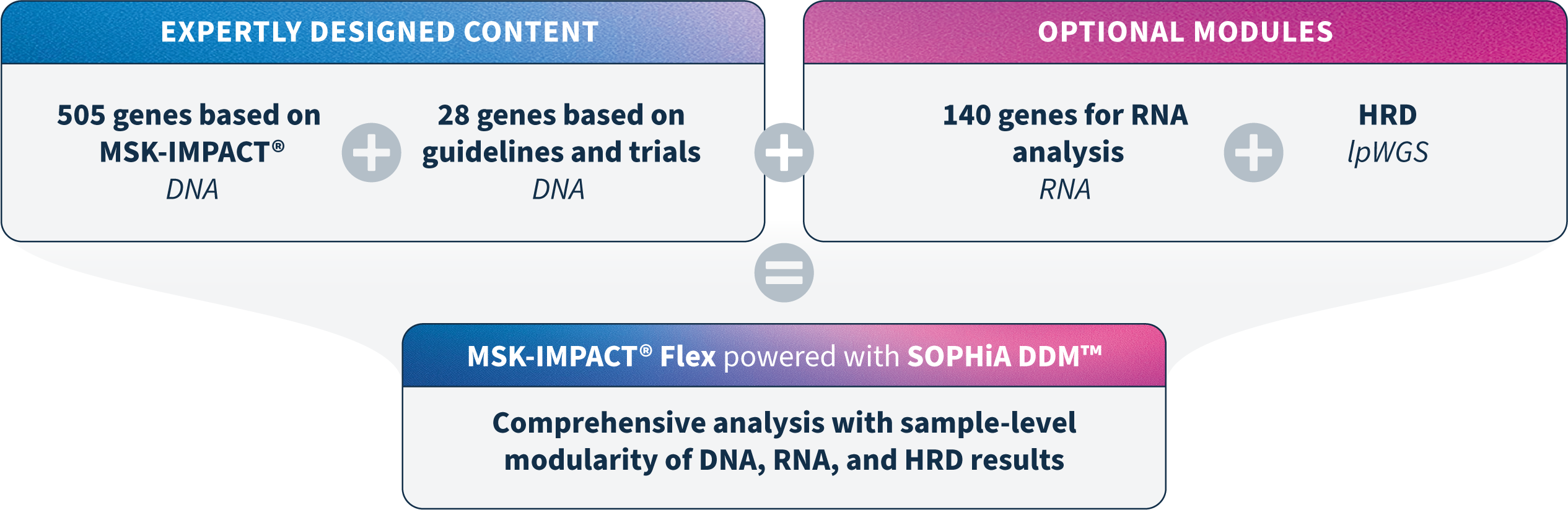 Built on the expert-designed content of MSK-IMPACT® and combined with the adaptive analytics of the SOPHiA DDM™ Platform, MSK-IMPACT® Flex powered with SOPHiA DDM™ delivers high-resolution profiling of complex biomarkers from DNA and RNA in a single, end-to-end workflow.